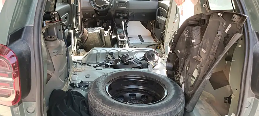 Araç ilk olarak iç trimler olmak üzere komple sökülmüştür. Değişimi gereken parçalar, onarımı mümkün olan parçalar tespit edilmiştir. Sabit kasa parçaları (arka çamurluk, tavan) onarımı için çaba harcanmıştır. Bu sayede araç üzerindeki orjinal meges uygulamaları hiç dokunulmadan onarım yapılmıştır.