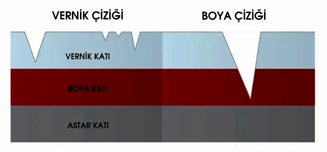 Boya çizin onarımı işlemi ne derece başarılı olabileceği konusunda yapılacak testler sonrasında net bir yanıt verilebilmektedir. Aşağıdaki görselden de anlaşılacağı gibi çizik derinliğinin ne aşamada oldu çok önemlidir. Vernik katı arasında olan çizikleri onarmak, oldukça başarılı sonuçlar verecektir. Peki çiziğin ne kadar derinde olduğunu nasıl anlayabilirsiniz? Bu iki farklı yöntemle basitçe anlaşılabilir; Birincisi çizin noktasına tırnağınız takılıyor mu? Ciddi bir takılma hissediyorsanız tehlike sınırındadır. Diğer yöntem ise bir sıvı dökerek, bir miktar suyu çizik noktasına döktüğünüzde çiziğin anlık kaybolduğunu görüyorsanız bu iyiye işarettir. Su teması sırasında farklı bir renk tonu, boya astar rengini görüyorsanız bunu pasta ile düzelmesi mümkün olmayacaktır.